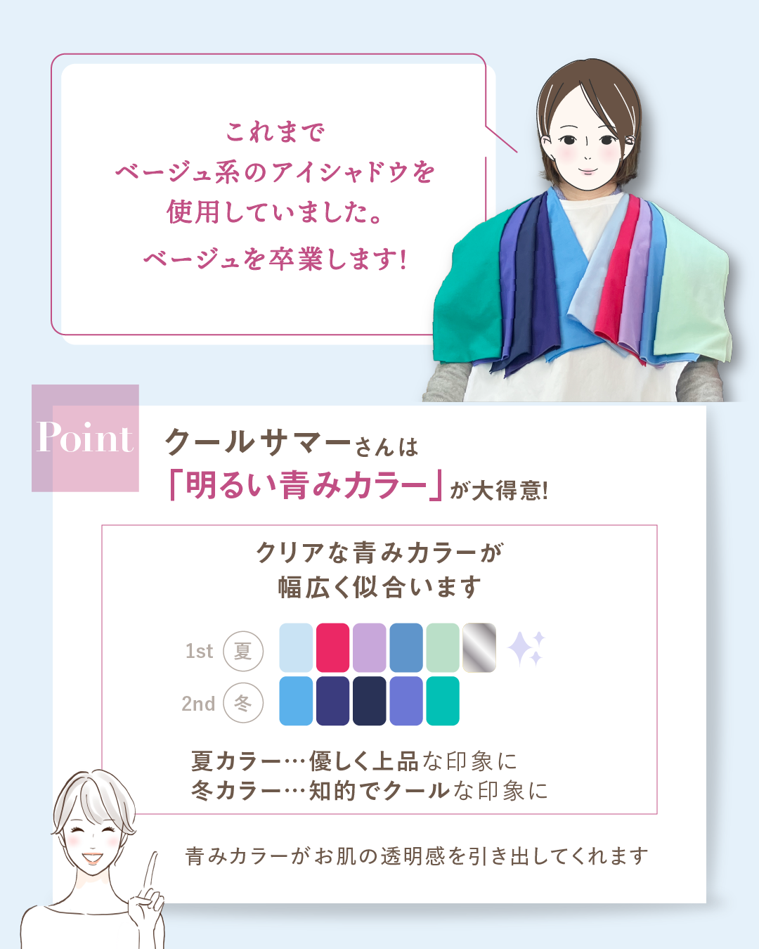 ブルベサマー向けの明るい青み系カラーのアイメイクをすると、
