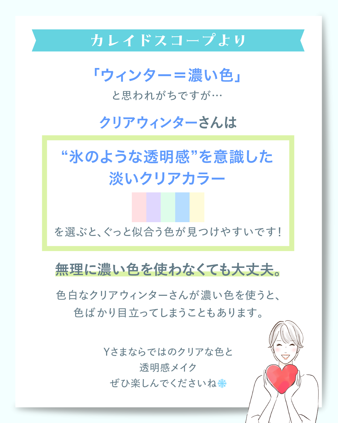 “氷のような透明感”を意識した淡いクリアカラーを選ぶと、ぐっと似合う色が見つけやすいです☝️