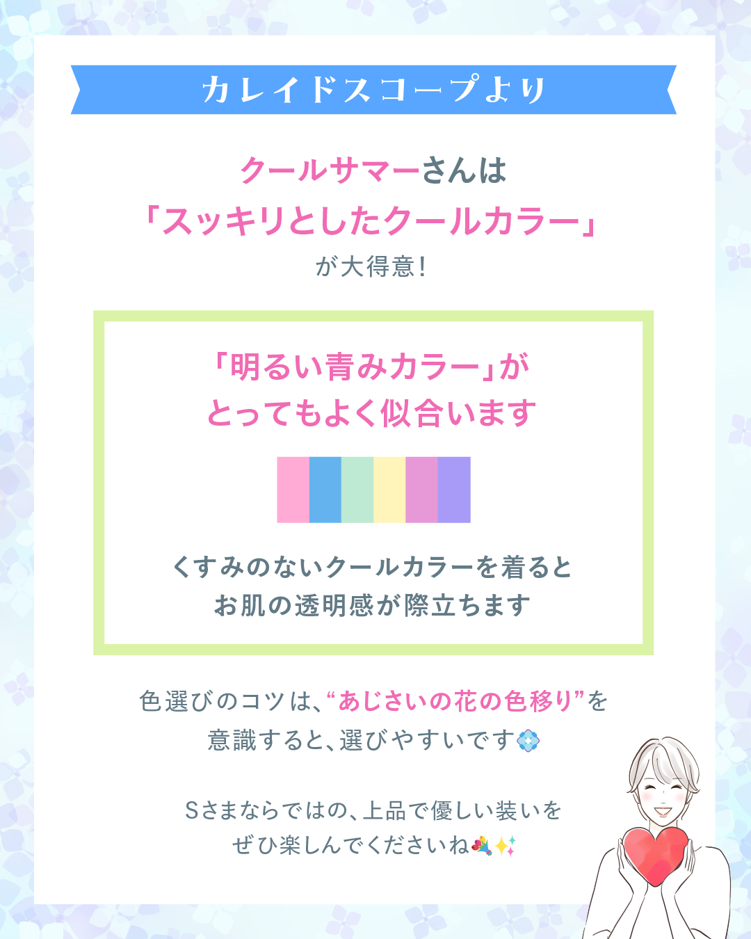 ・あじさいのような淡いブルーやラベンダーをまとうと、上品でやさしい印象に💠