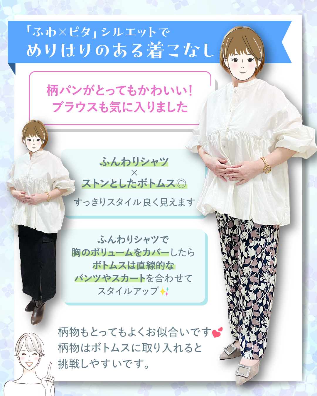 ⚠️ ギャザーやフレアなどボリュームのあるスカート、首元が詰まったトップスは苦手