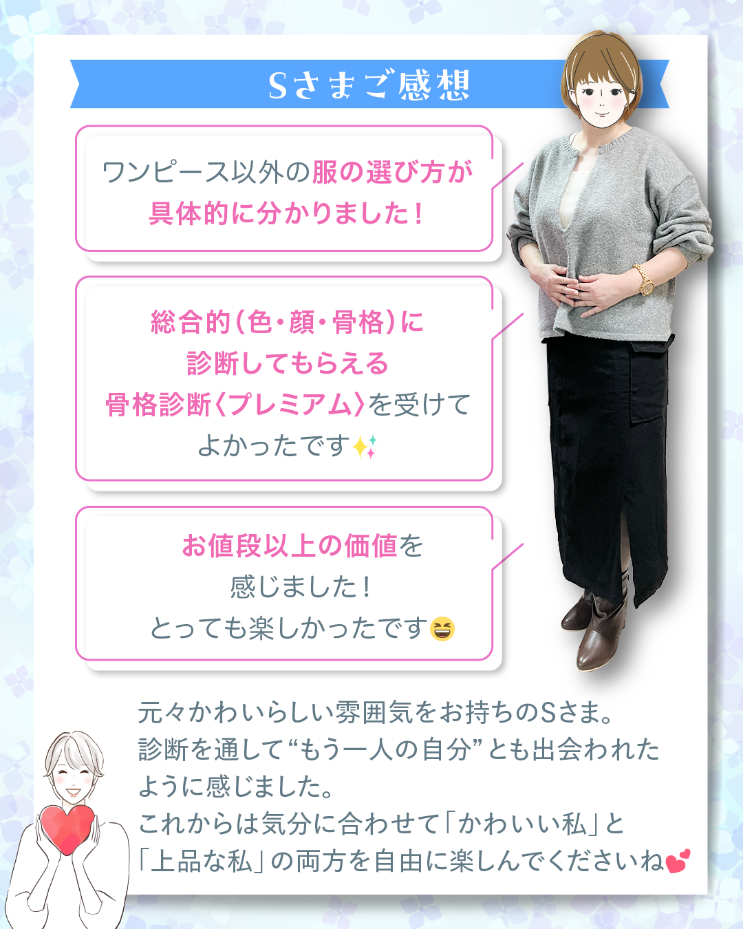 総合的(色・顔・骨格)に診断してもらえて、服の選び方が具体的に分かりました🥰