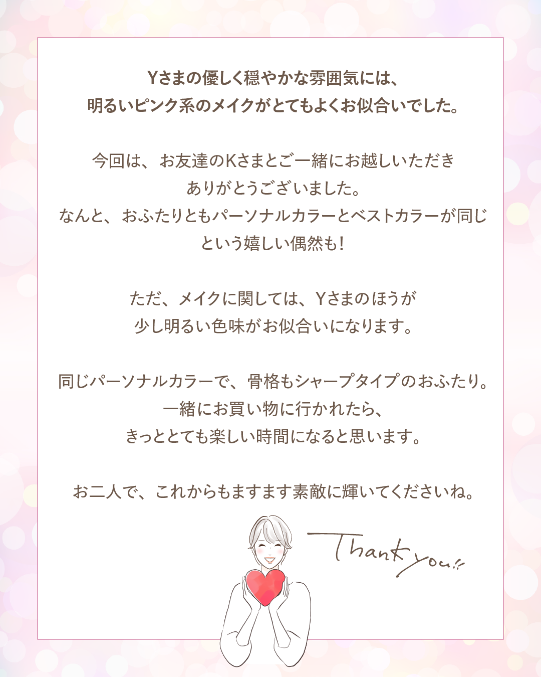 今回は、お友達のKさまとご一緒にお越しいただきありがとうございました。
