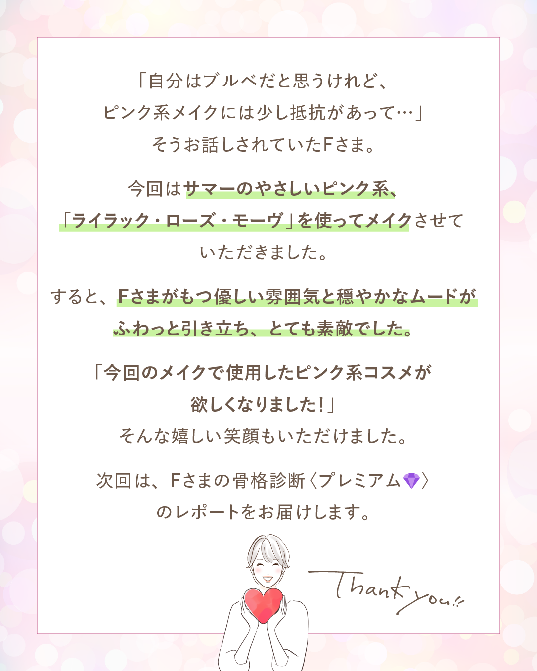 ピンク系メイクが大変お似合いなので、これからはうんと楽しんでくださいね!
