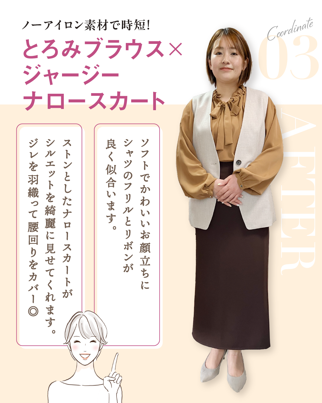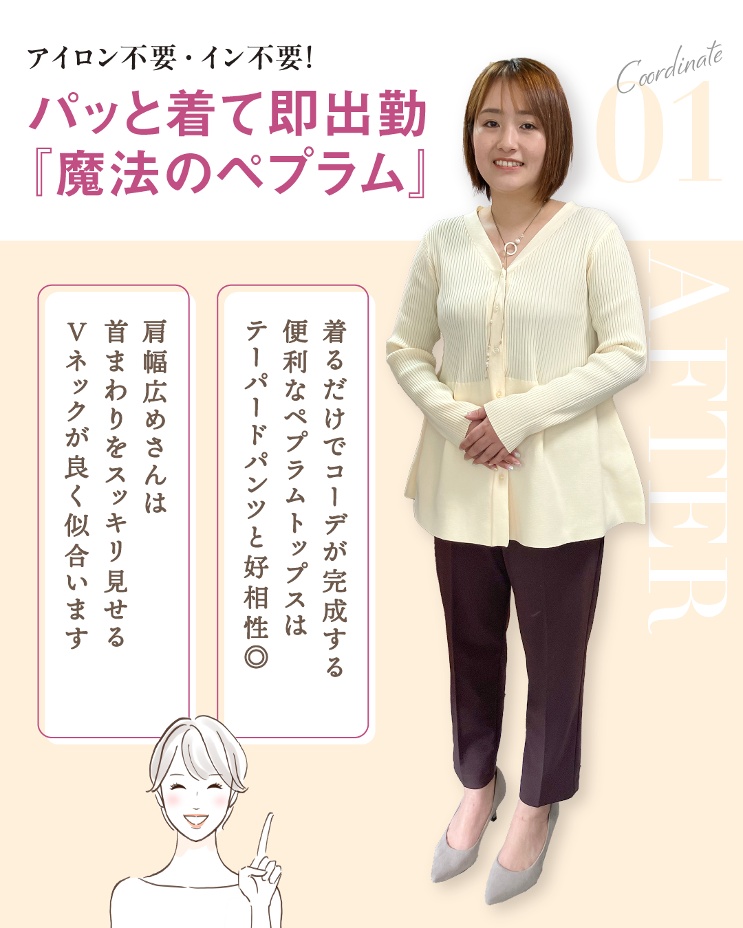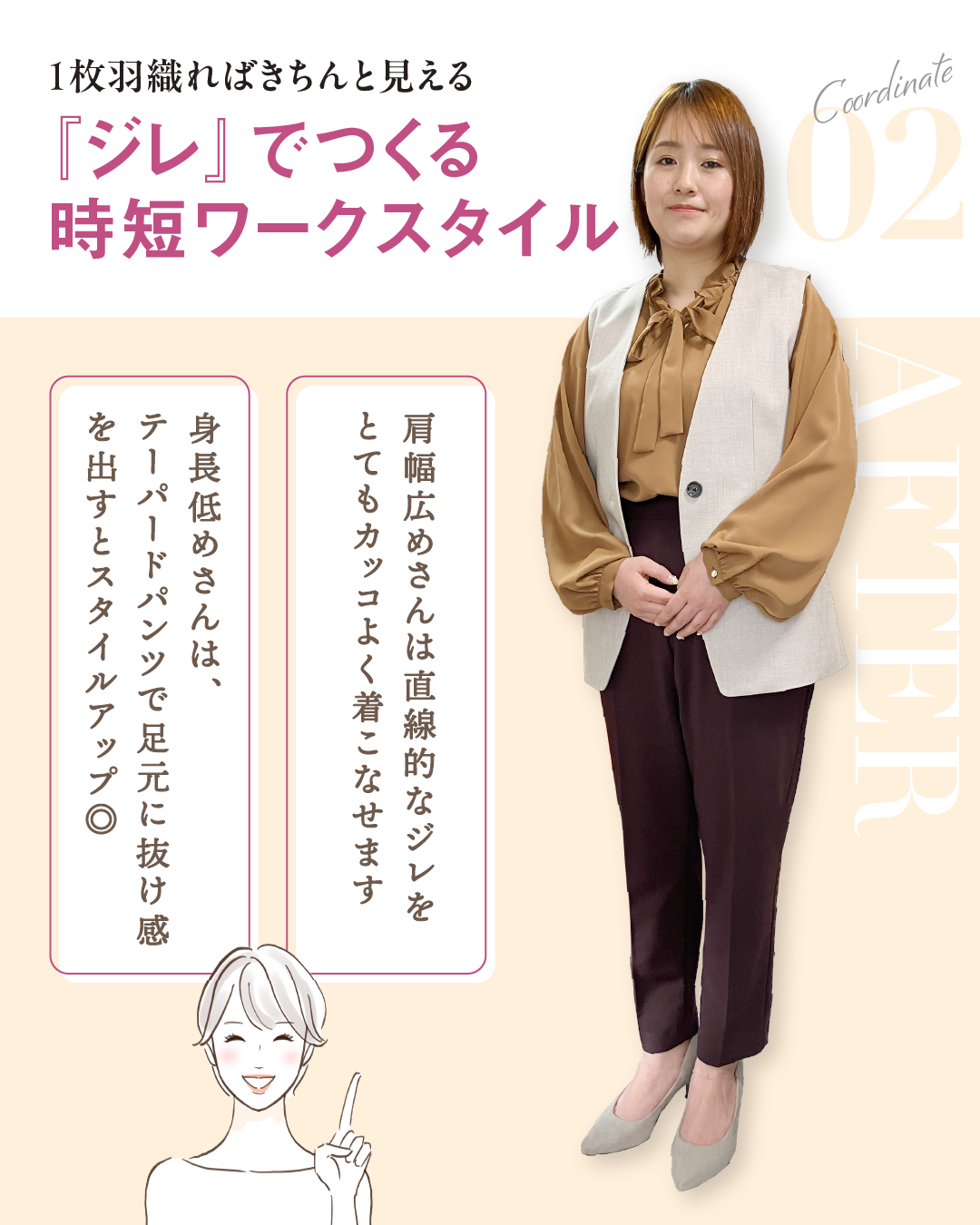 今回は、1枚でコーデが完成する「ペプラムトップス」や、羽織るだけできちんと感が出る「ジレ」を主役に、直線的なシルエットを意識したスタイルアップ術をお伝えしました。