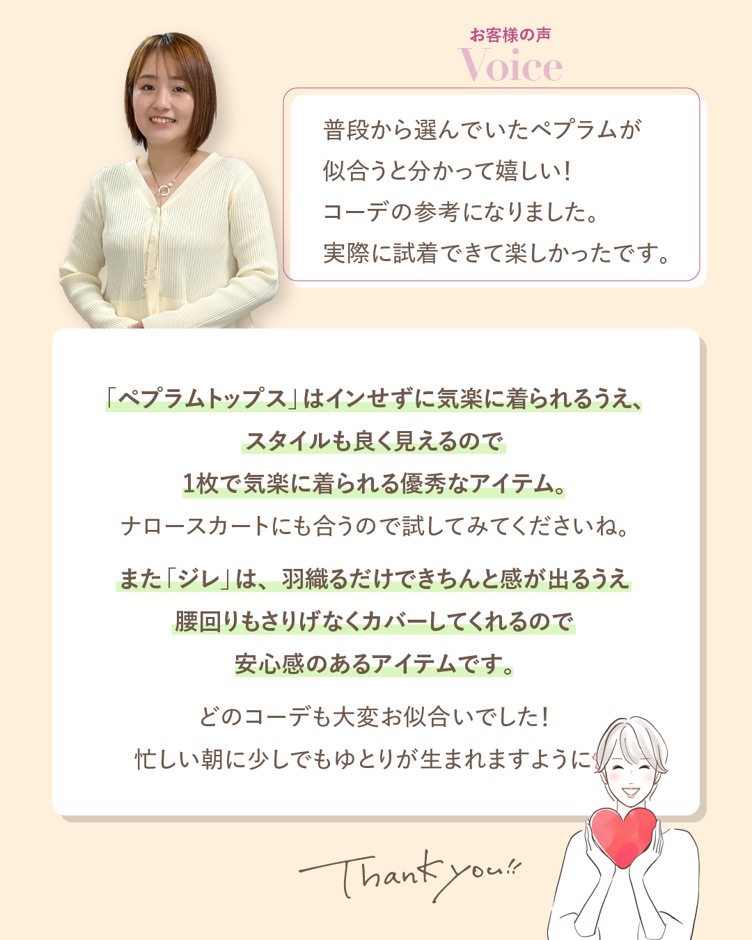 「実際に試着できたことで、明日からの着こなしがイメージできました。とても楽しかったです!」と嬉しいお言葉をいただきました。