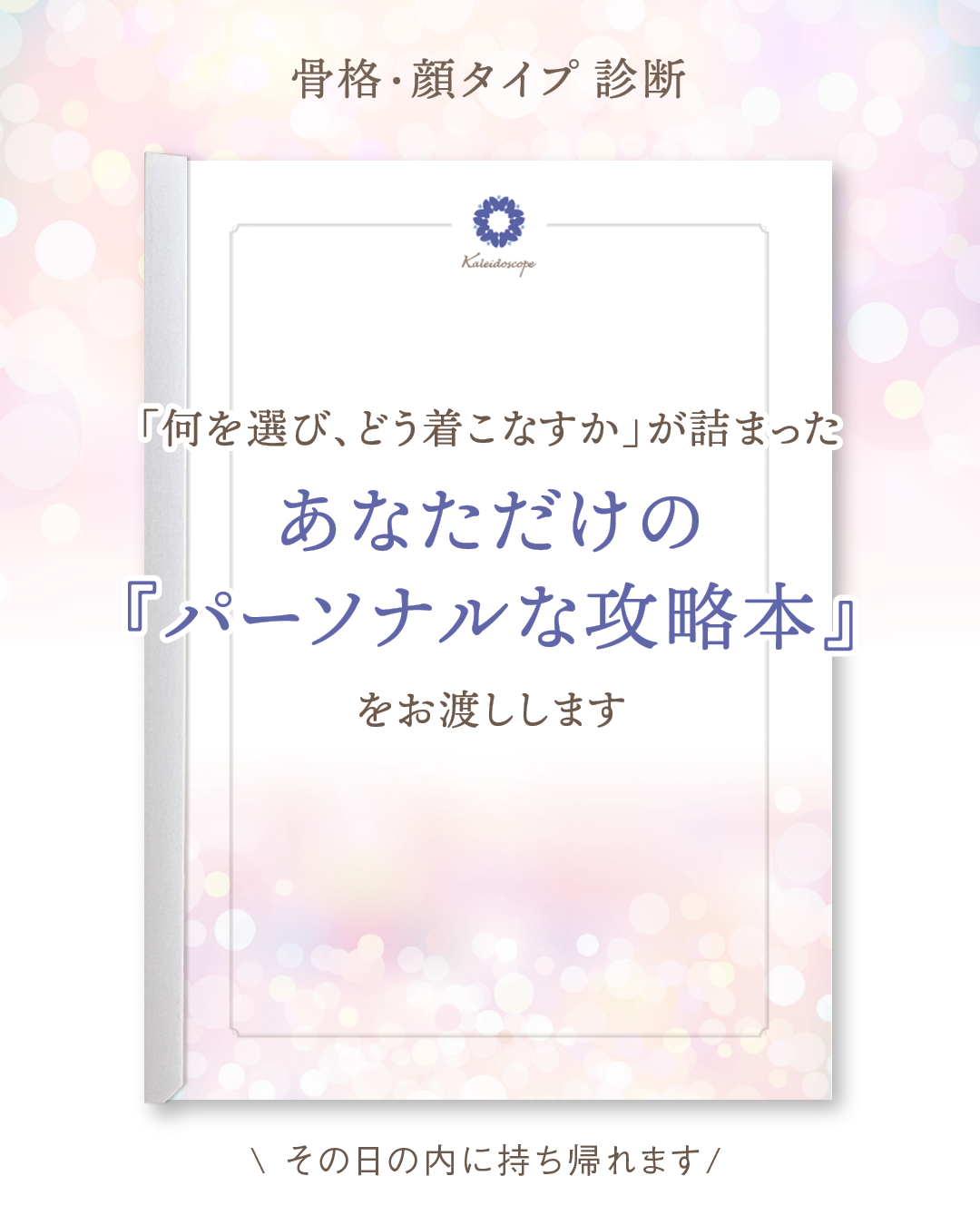 骨格・顔タイプ診断を受けられた方には、「何を選び、どう着こなすか」という実践的な答えを凝縮した、あなただけのパーソナルな攻略本をお渡ししています。