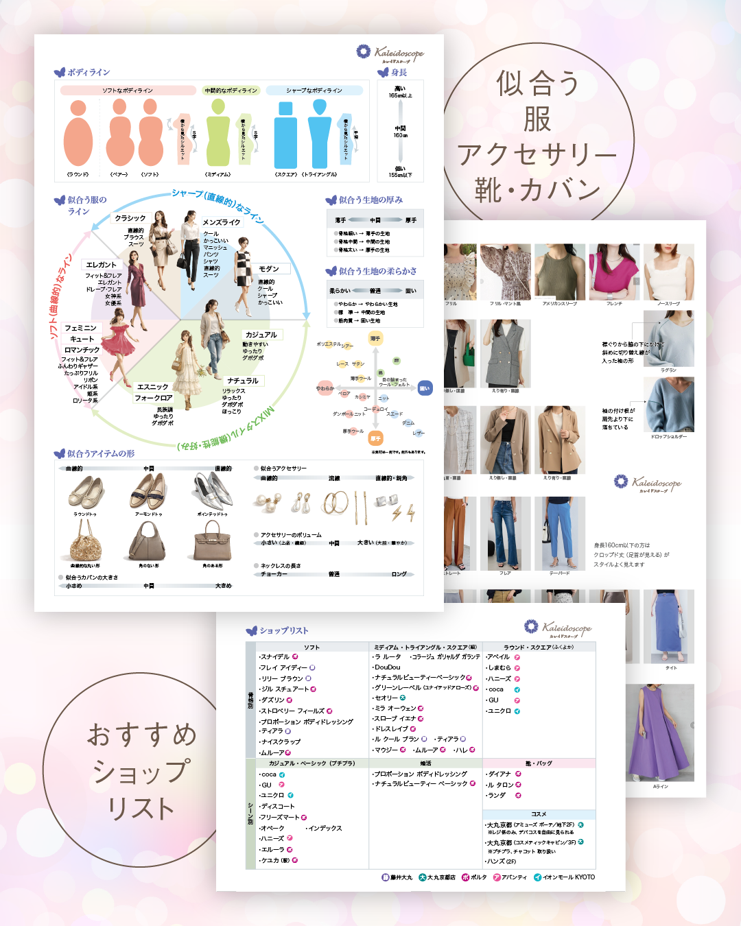 これらの資料はすべて、現役のグラフィックデザイナーでもあるオーナーが、情報の整理から視覚的なレイアウトまでこだわり抜いて制作した、カレイドスコープ独自のツールです。