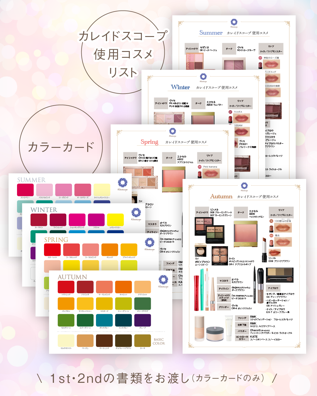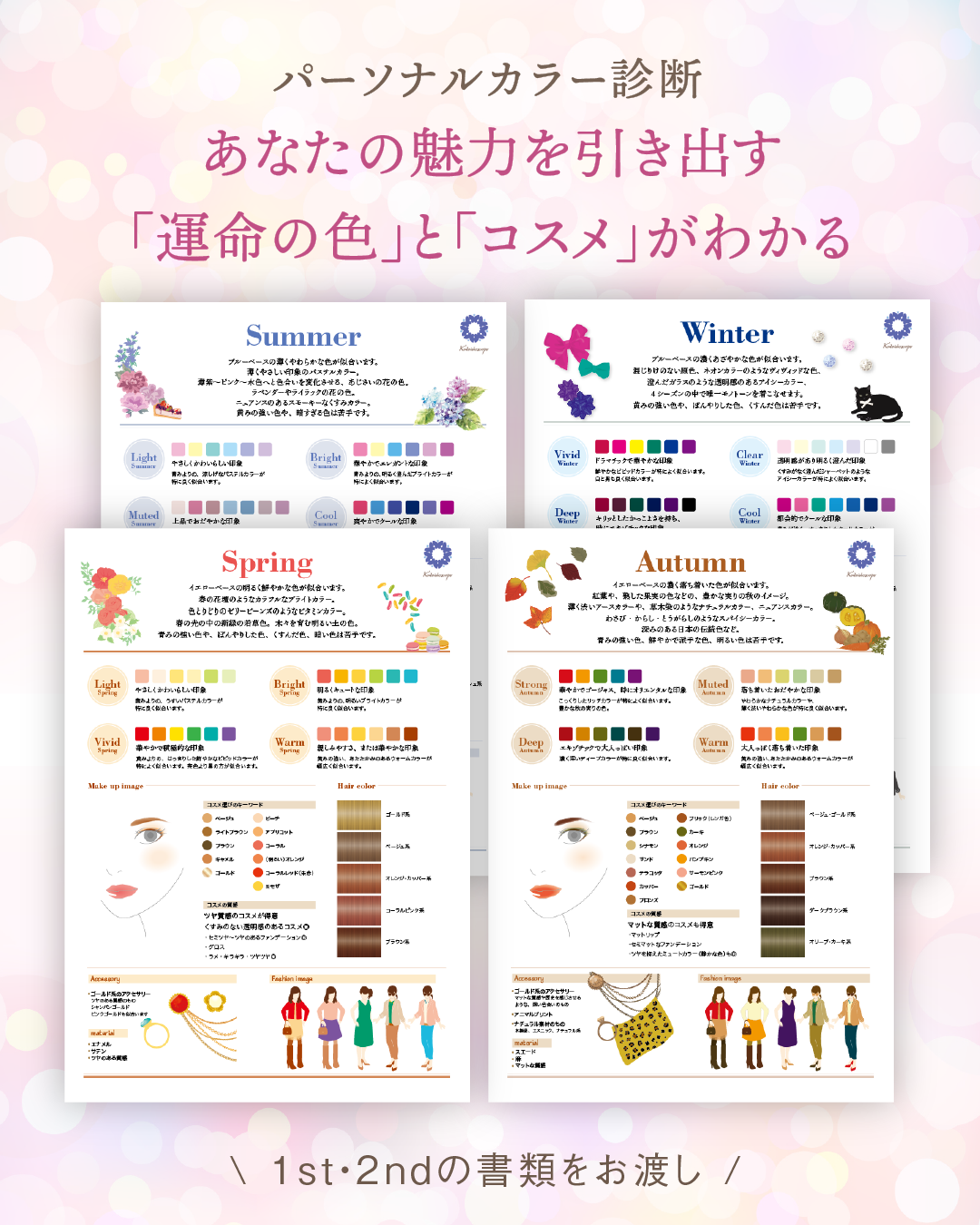 また、パーソナルカラー診断では、あなたの魅力を引き出す「運命の色」はもちろん、似合うコスメがひと目でわかるオリジナル診断書・カラーカード・コスメリストをご用意。