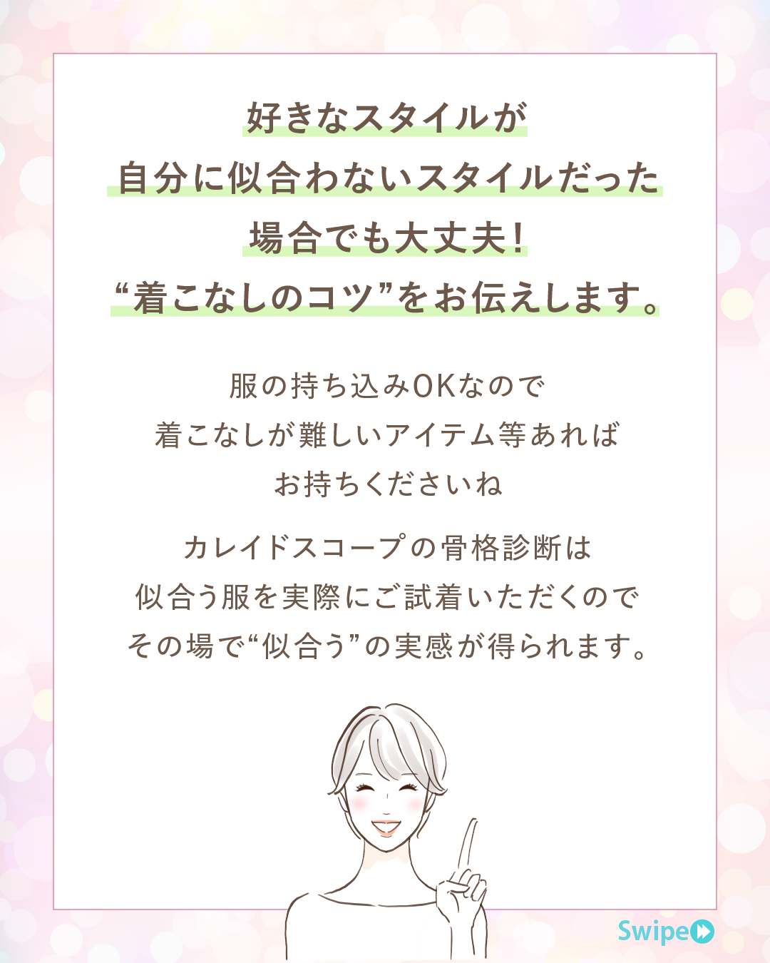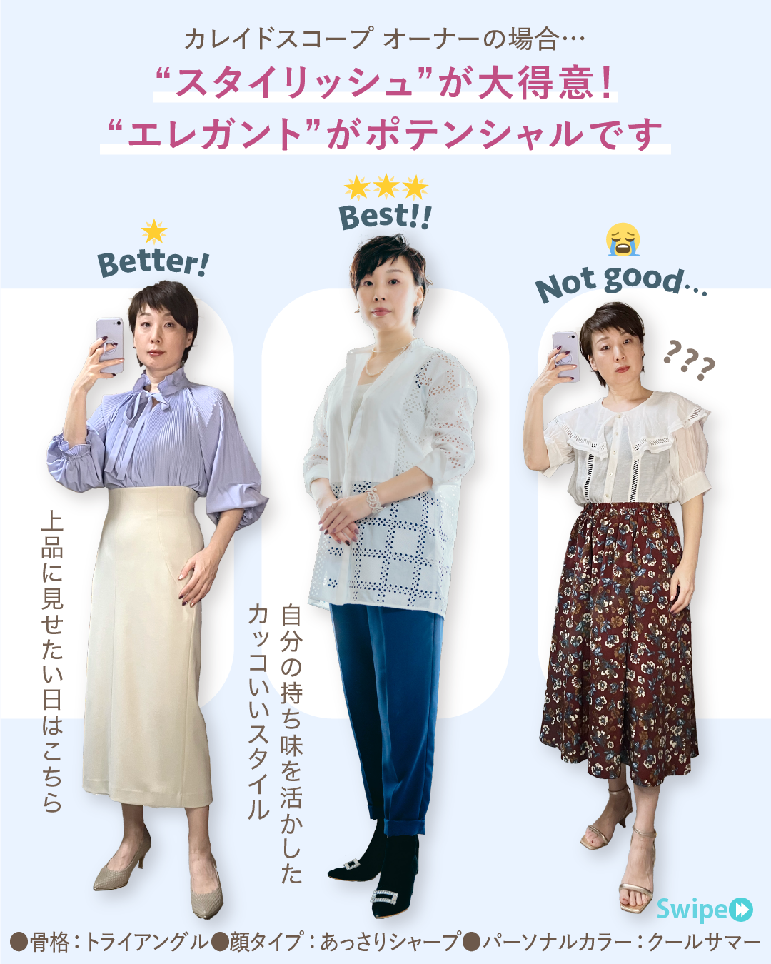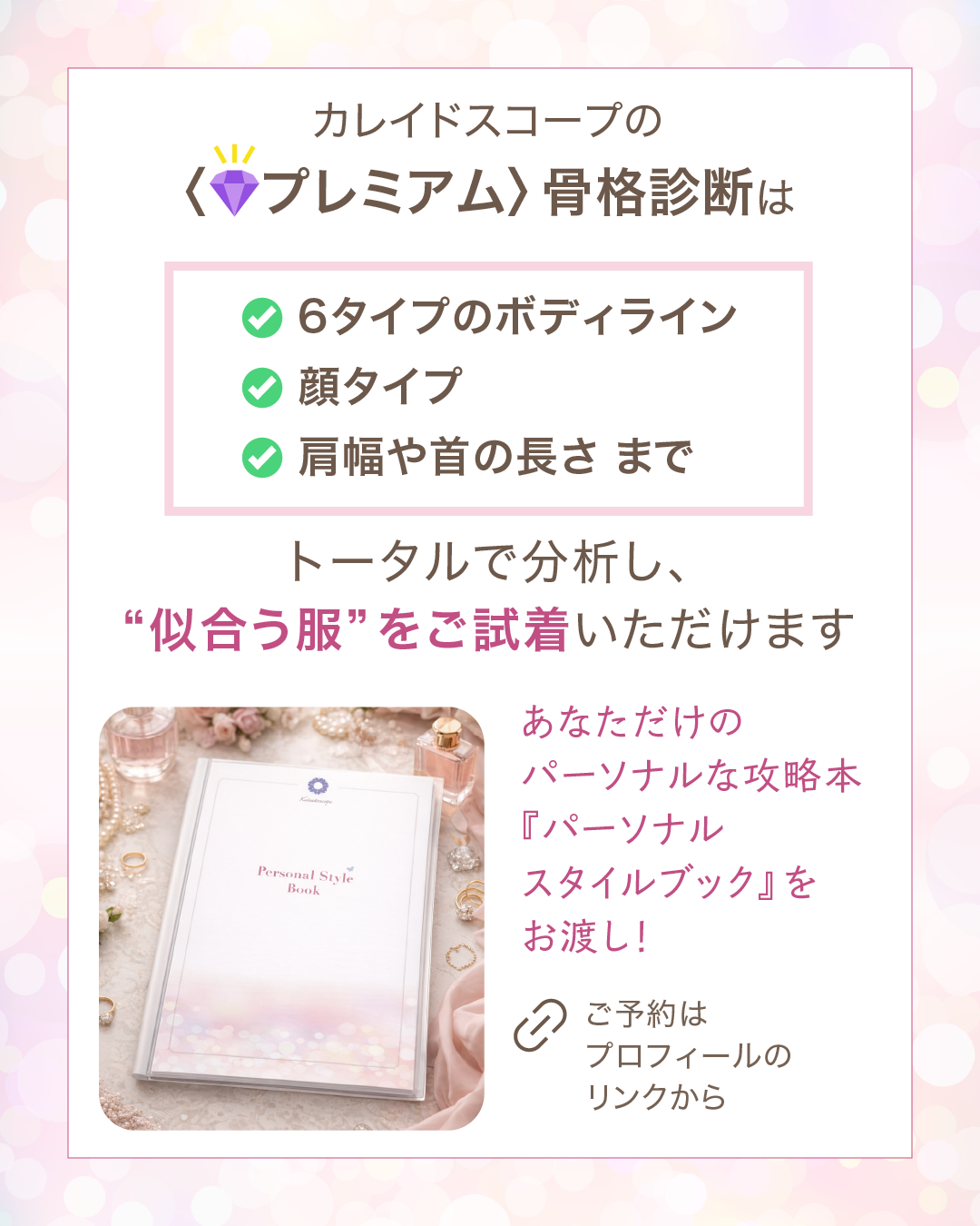 カレイドスコープでは、骨格診断と顔タイプ診断を通じて、あなたの「装いのポテンシャル(=まだ発揮されていない可能性)」を導き出します。