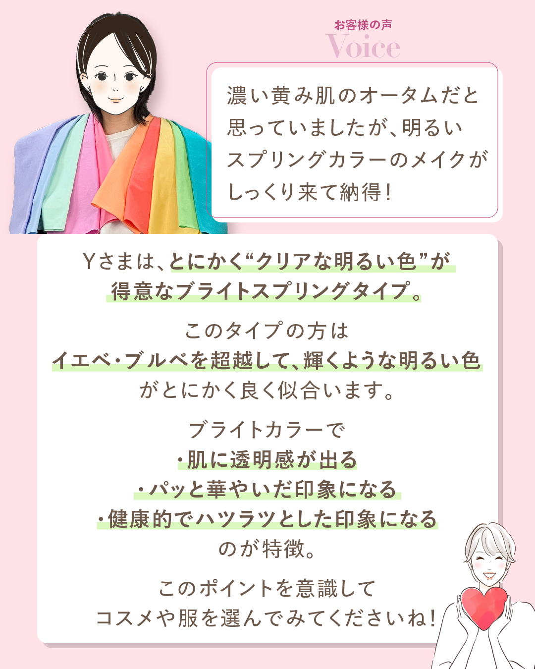 暗い色でお顔が沈んで見えていたYさまも、クリアで明るい「正解の色」を当てるだけで、お肌の透明感が劇的にアップ!