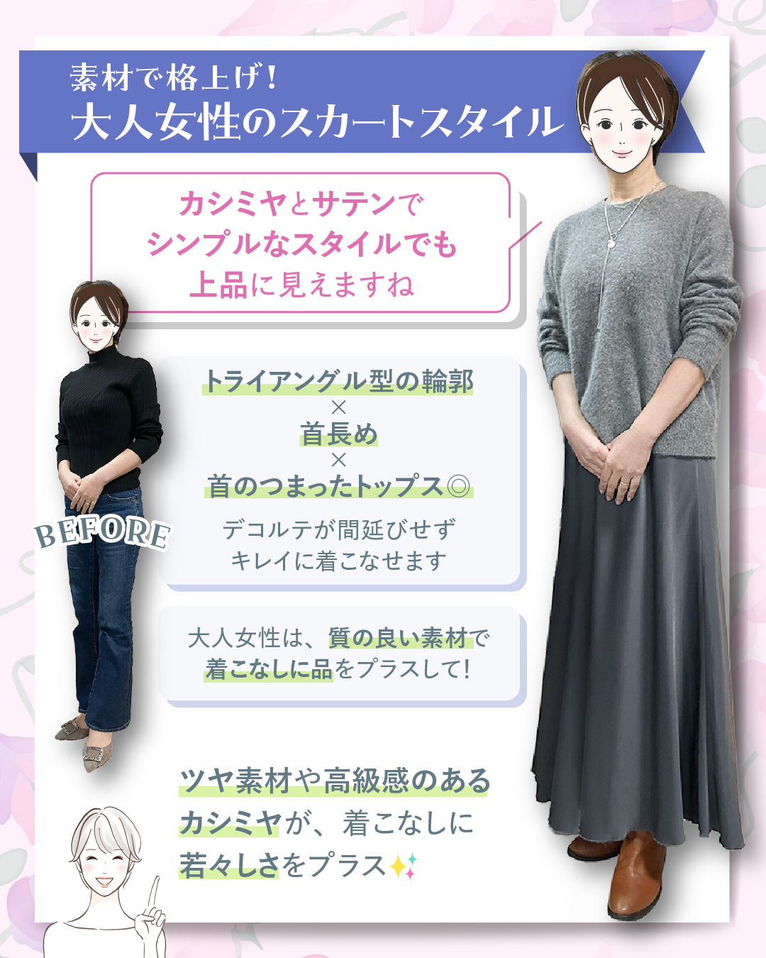 ・カシミヤやサテン素材を取り入れて、上品さをプラス