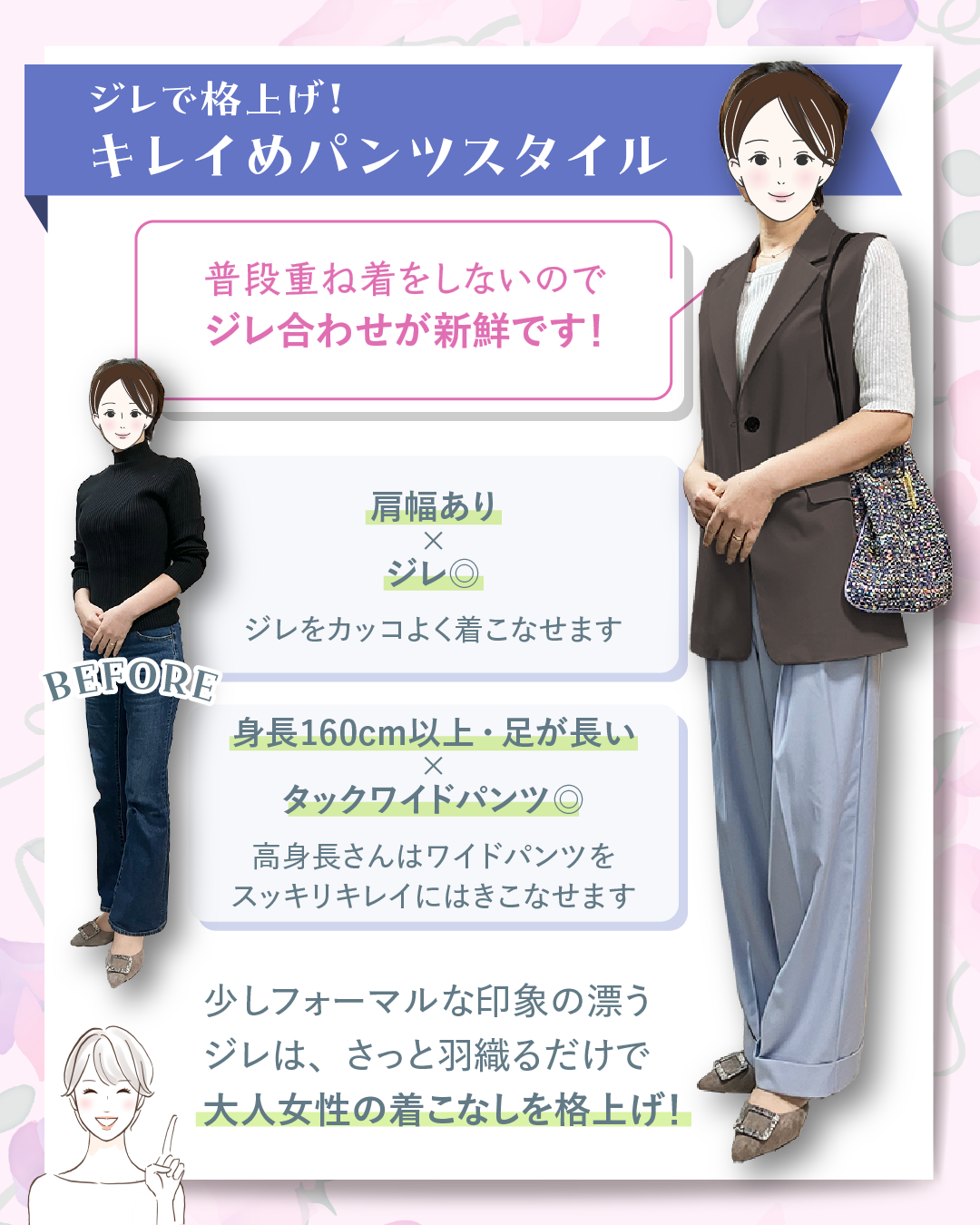 ・カチッとしたジレを羽織るだけでも“きちんと感”がアップします✨