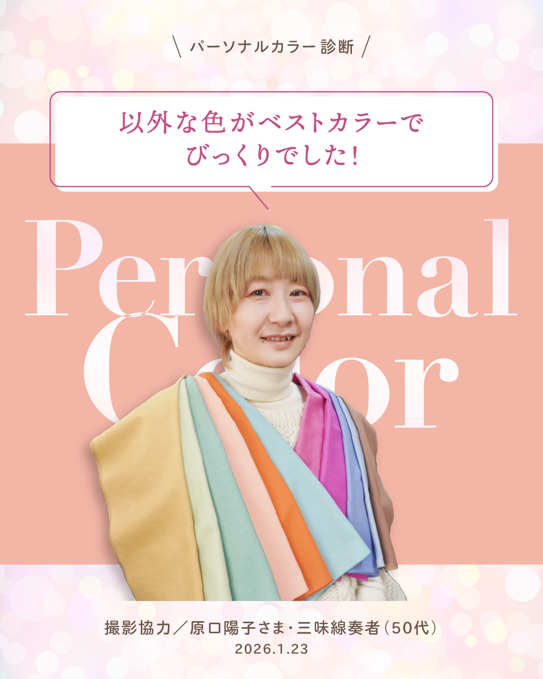ですが、メイクをして似合うドレープを改めて当ててみると、「なんだか若く見える…!」とご自身の印象の変化に気づいてくださいました😊