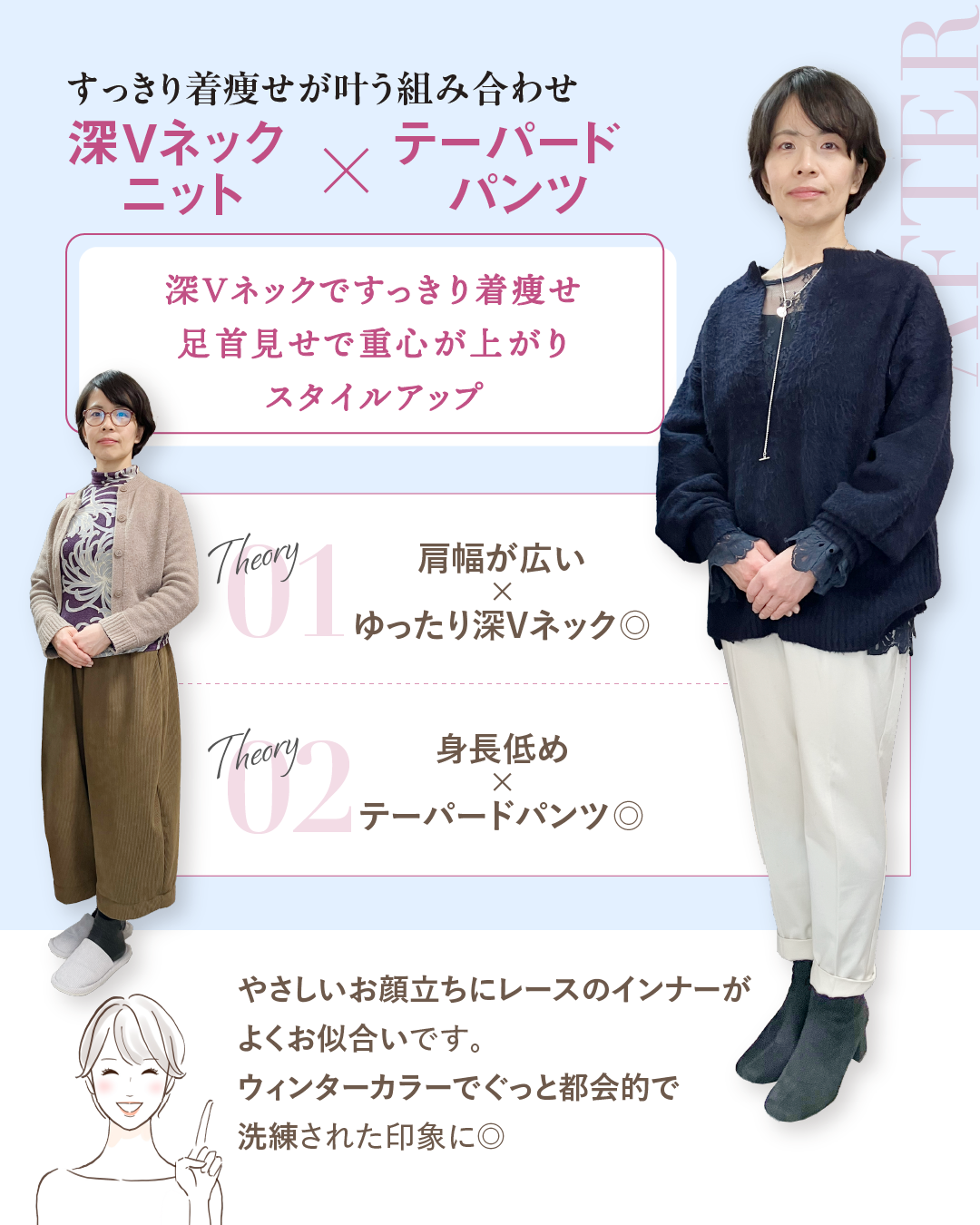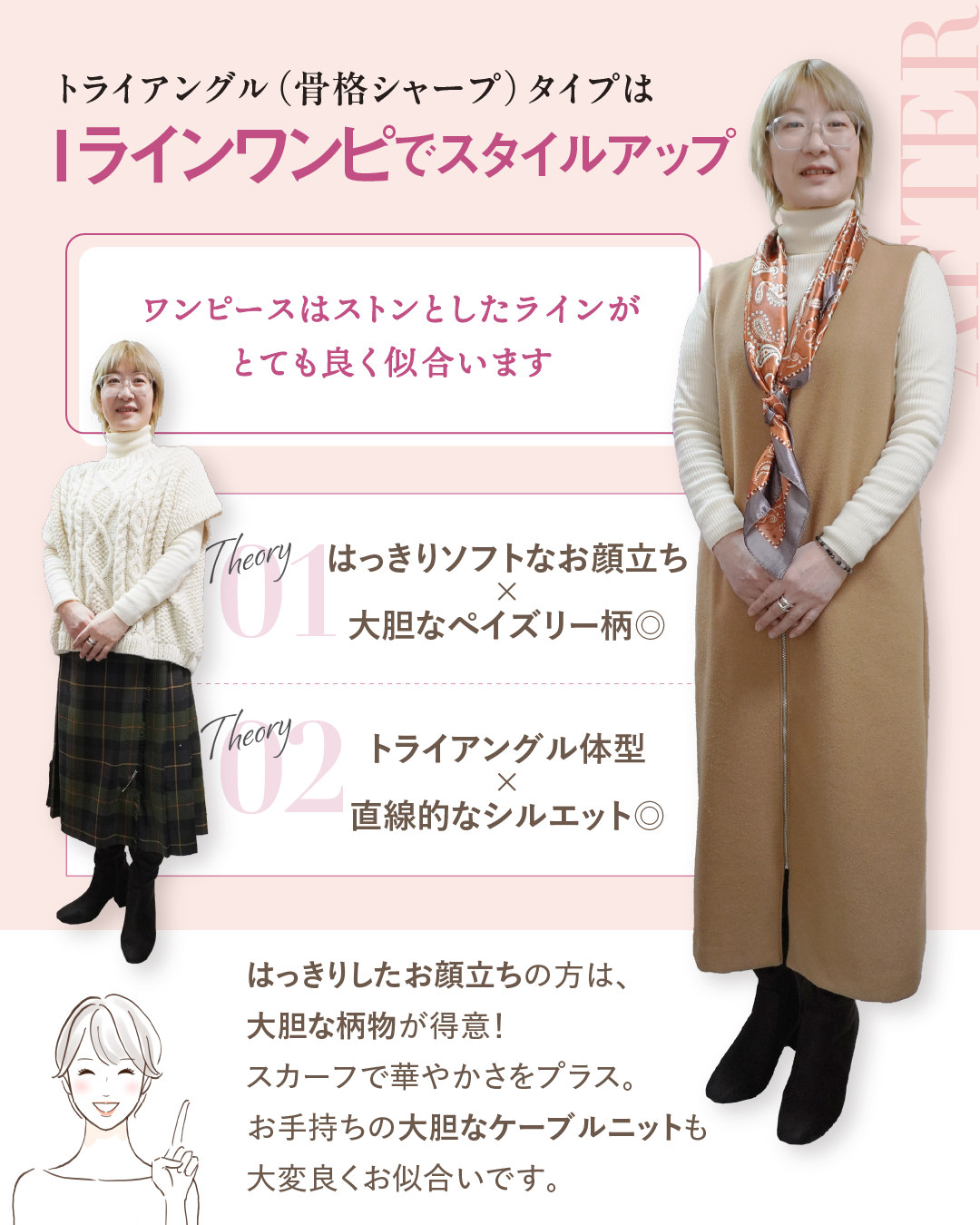 さらに、パーソナルカラー「ウィンター」との相乗効果で、ぐっと都会的で知的な印象に。