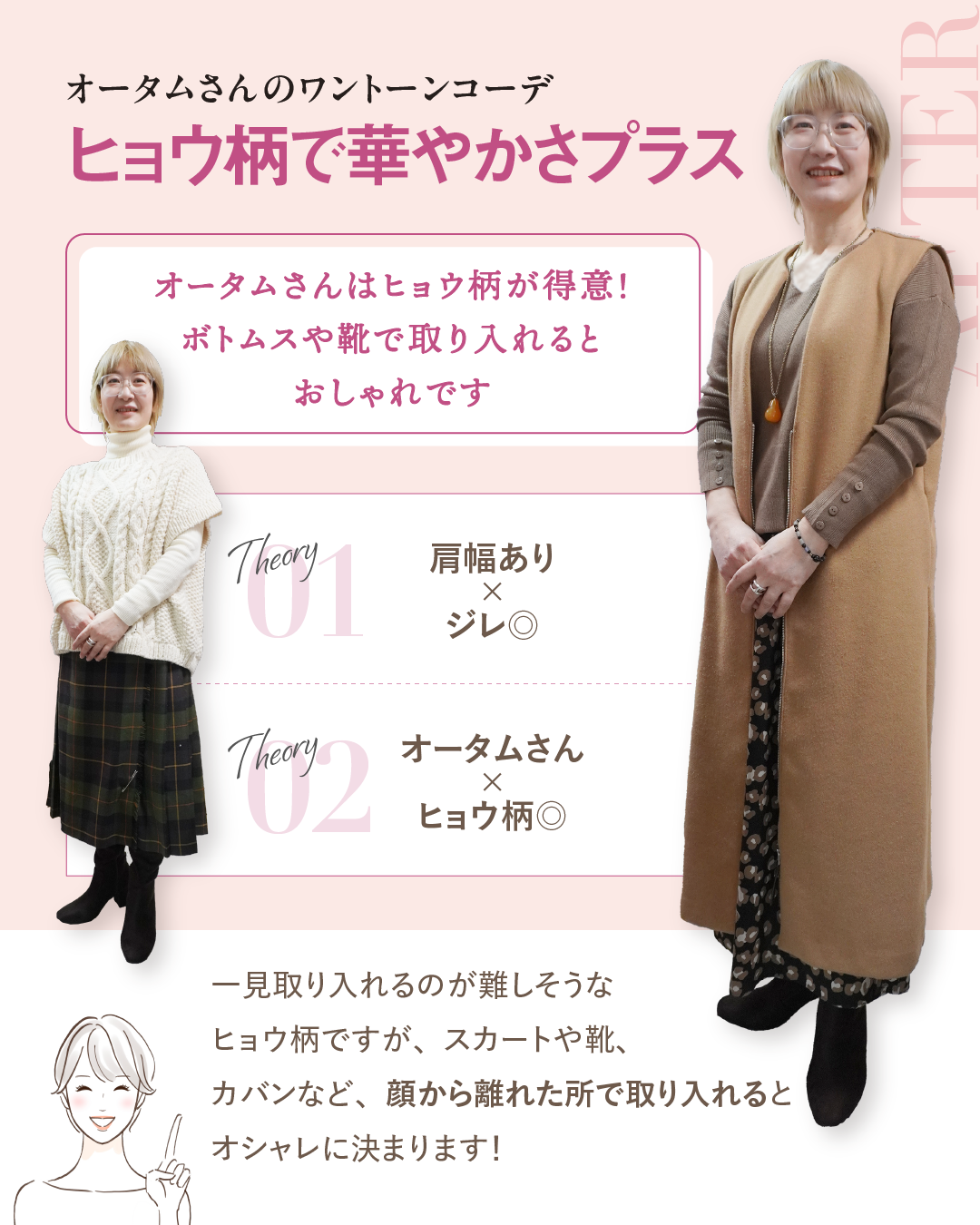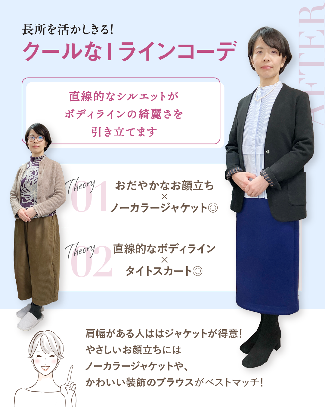 普段のナチュラルな着こなしも素敵ですが、長所を活かしたクールなスタイルも、ぜひ楽しんでいただけたら嬉しいです。