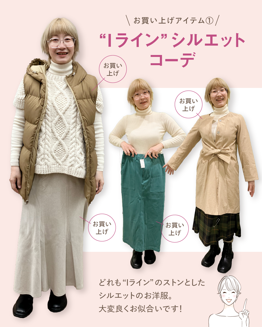 似合うワンピースを探しておられたので、トライアングル体型にしっくり来る〈Iラインシルエット〉をご提案。