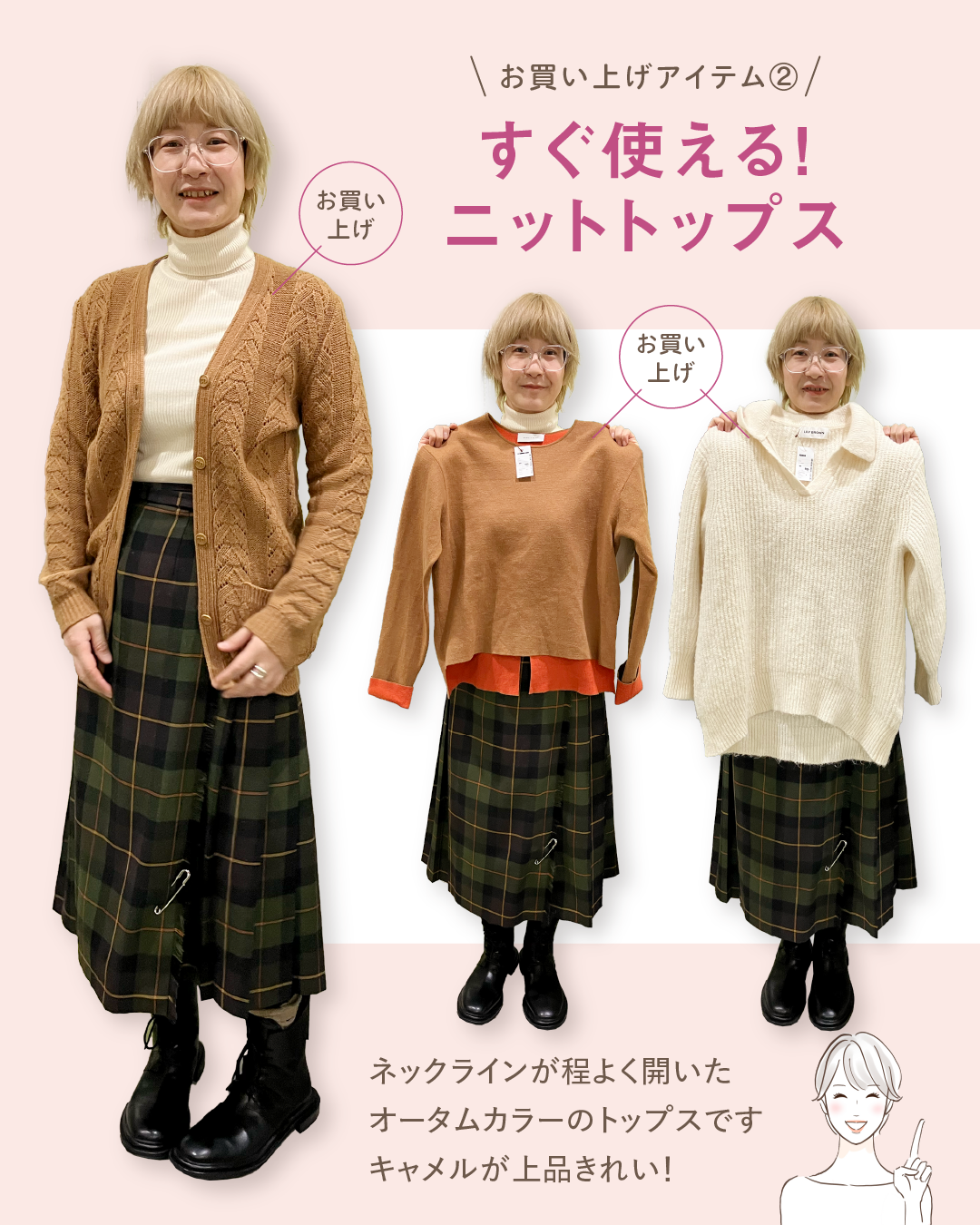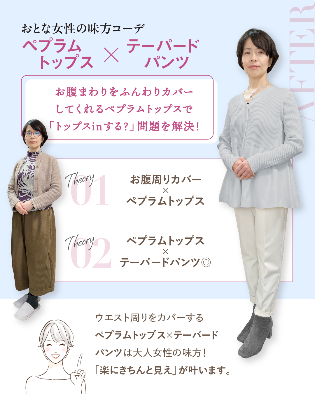 お腹まわりをふんわりカバーできる「ペプラムトップス」や、インせず着られるフリルデザインのブラウスをご提案しました。