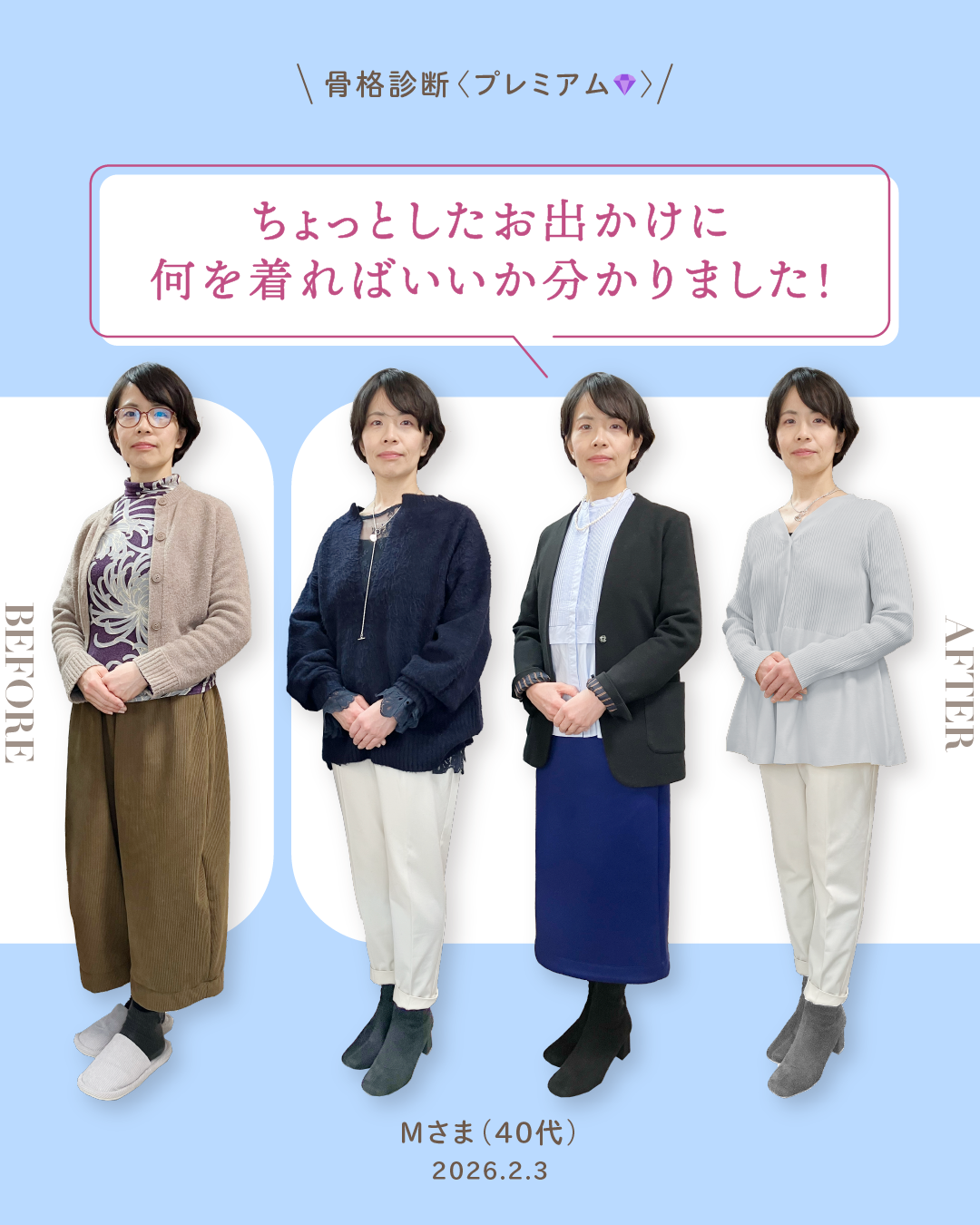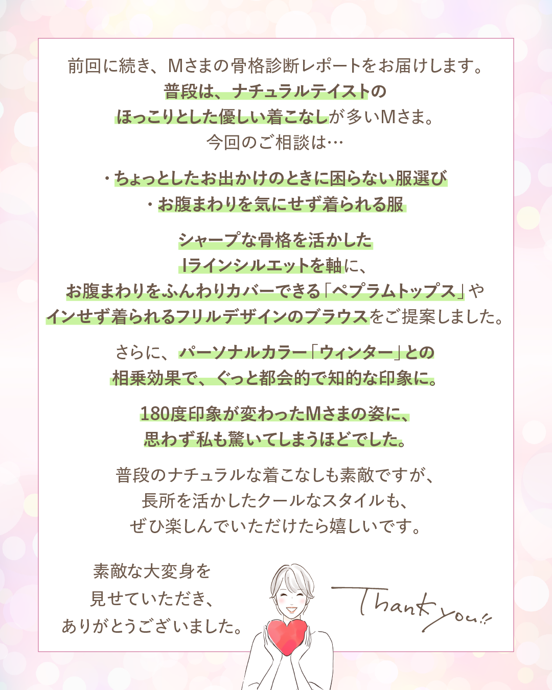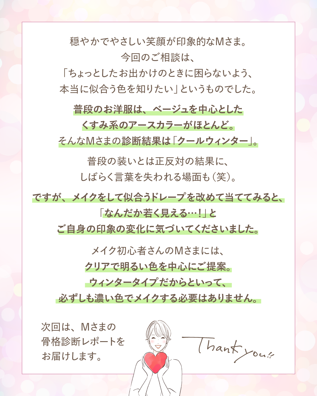 次回は、Mさまの骨格診断レポートをお届けします。お楽しみに!