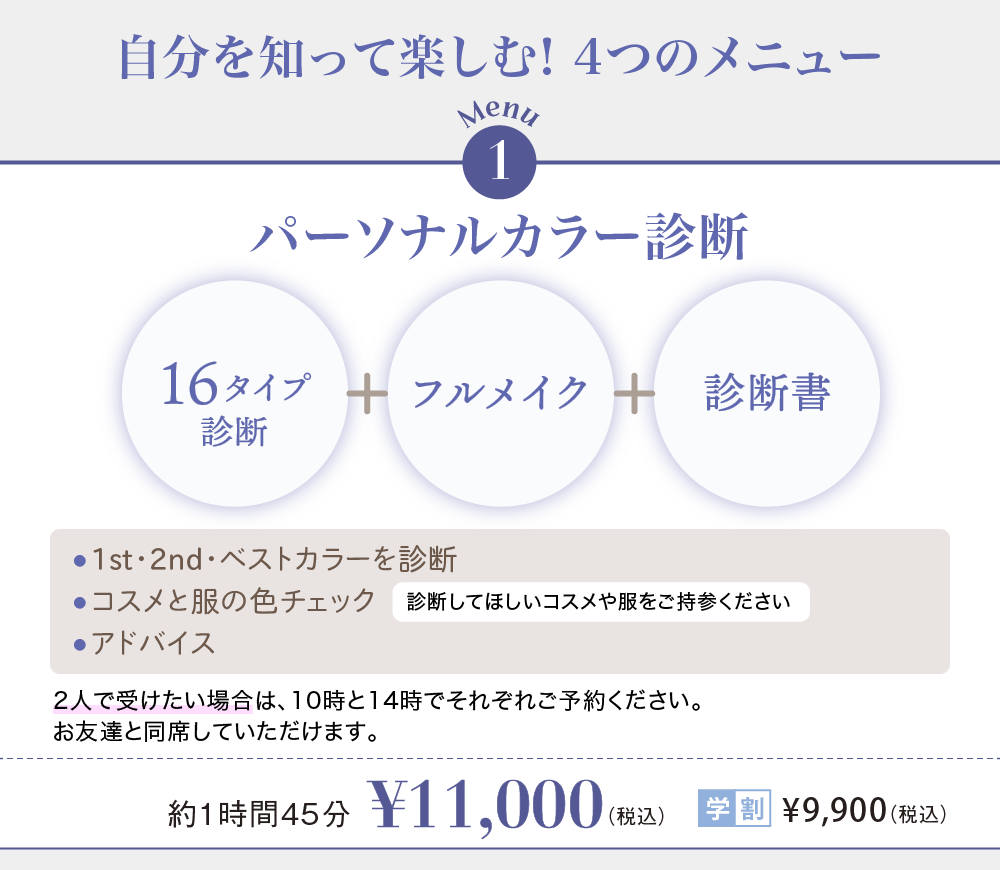 ・1st、2nd、ベストカラー を診断 ・フルメイク込み ・コスメチェック・服チェック ・アドバイス