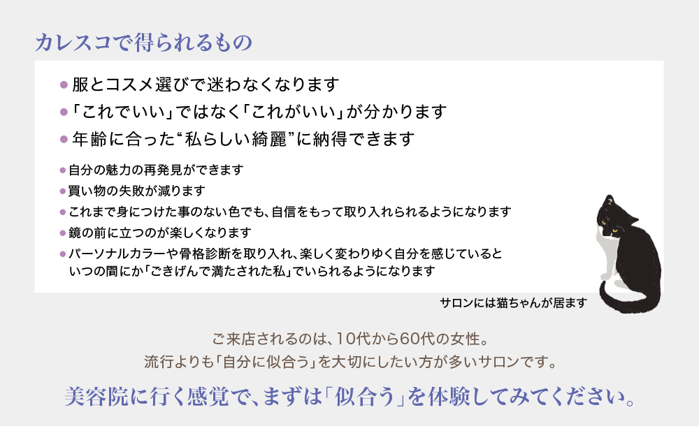 ・1st、2nd、ベストカラー を診断 ・フルメイク込み ・骨格診断(顔8タイプ+ボディライン6タイプ) ・似合う服を試着 ・写真撮影(スマホ) ・コスメチェック・服チェック ・アドバイス ・LINEで質問1回OK