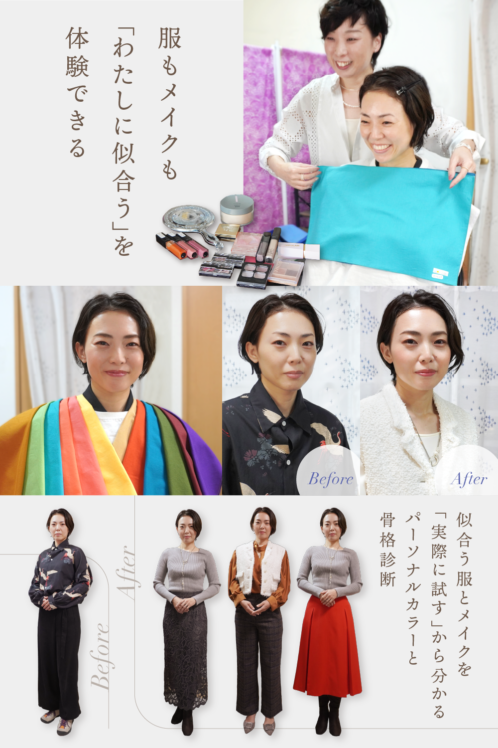 ・1st、2nd、ベストカラー を診断 ・フルメイク込み ・骨格診断(顔8タイプ+ボディライン6タイプ) ・コスメチェック・服チェック ・アドバイス