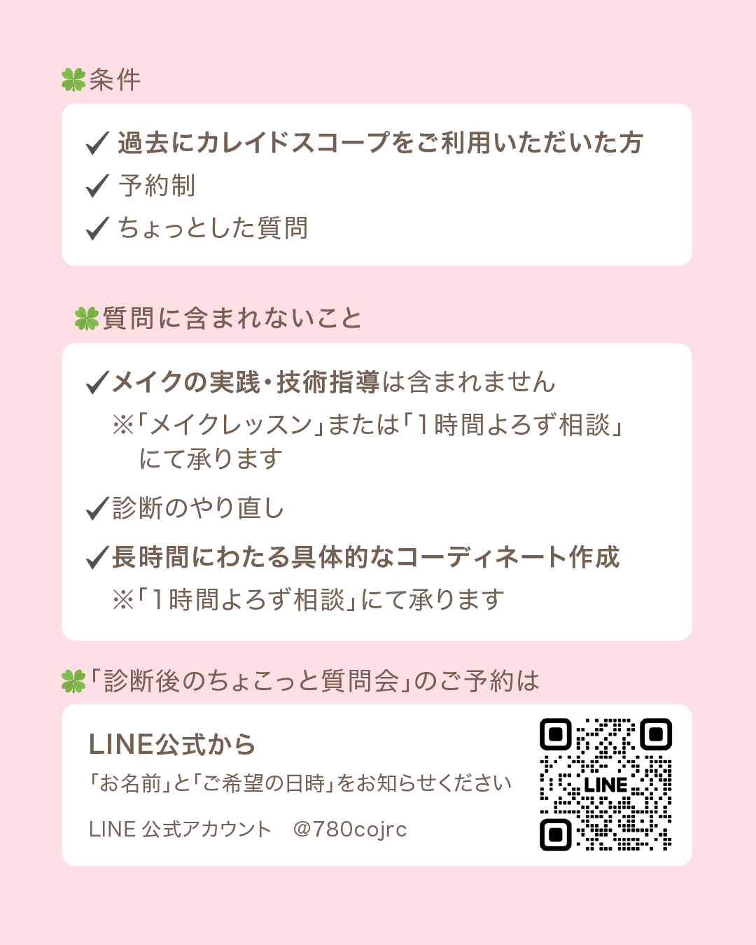 ※「メイクレッスン」または「1時間よろず相談」にて承ります